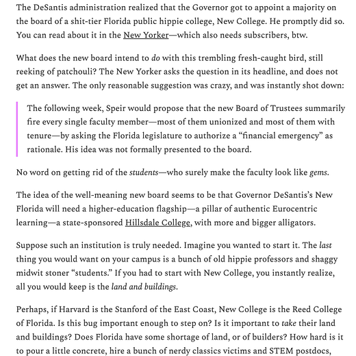 Meanwhile, Chris Rufo is out here platforming a “friendly critique” of his takeover College of Florida written by a guy named Curtis Yarvin a/k/a Mencius Moldbug.