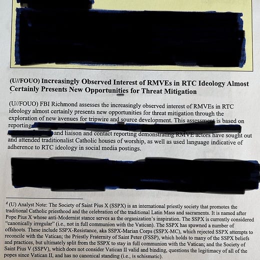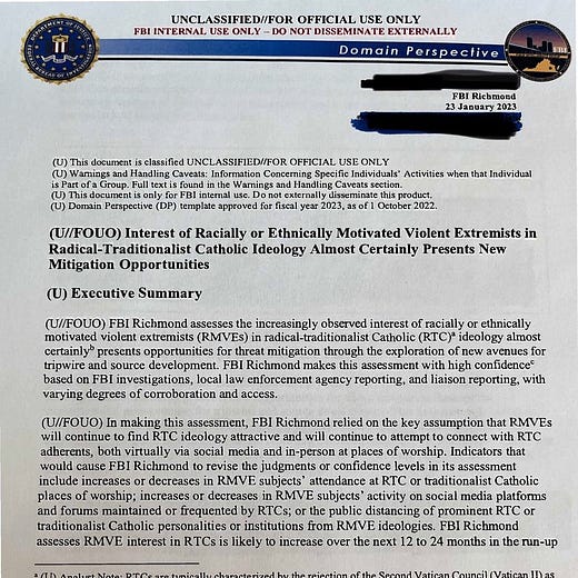 On February 10th, attorneys general from twenty states signed a letter to U.S. Attorney General Merrick Garland condemning an "anti-Catholic" memo purportedly from the FBI's field office in Richmond, Virginia. While I believe it unequivocally wrong to target a group of individuals simply because of their religious beliefs, the document in question goes out of its way to state that’s not what they’re doing. If you actually read the internal document—which the FBI has since acknowledged and disavowed—it's clear they’re not targeting Catholics for simply being Catholic. Instead, whomever wrote this internal memo is interested in extremists who pose a violent threat and also happen to be or to at least call themselves Catholics. These are radical-traditionalist Catholics (RTCs) who are simultaneously ethnically motivated violent extremists or RMVEs. Specifically cited in the document is the website Church Militant, a nominally Catholic extremist group, and Nick Fuentes—a white nationalist “Trad Cath” who was recently banned from Twitter for his virulent anti-Semitism which included a statement of “declaring war” on the Jewish people. Much of what I’ve already written here was outlined first by an activist and citizen journalist named Goad Gatsby both on his Twitter account and his Substack, and I do not simply wish to rehash the great work he’s already done. However, there’s an unexplored aspect of this story which I believe warrants further attention.